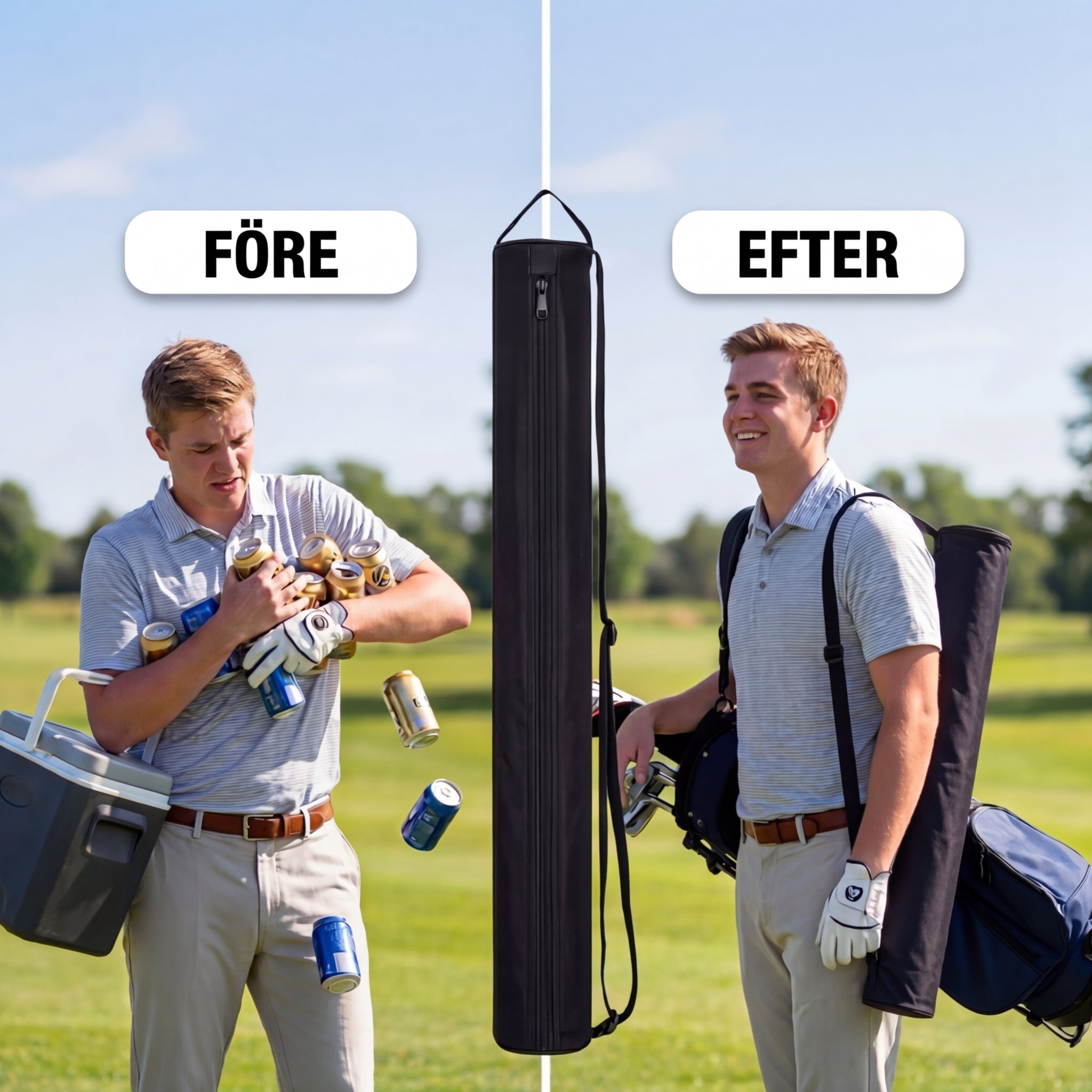 Därför har vi tagit fram CADDYSOCK: En diskret, cylinderformad kylväska som håller dina drycker kalla från första tee till sista putt. Inga fler klumpiga kylväskor. Inga fler ljumna drycker redan efter några hål.